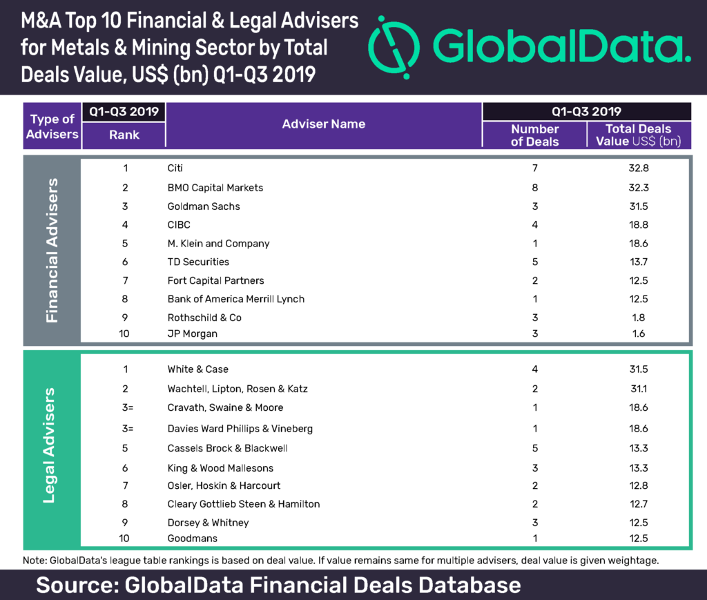 Top ten metals & mining M&A financial and legal advisers for 2019 revealed