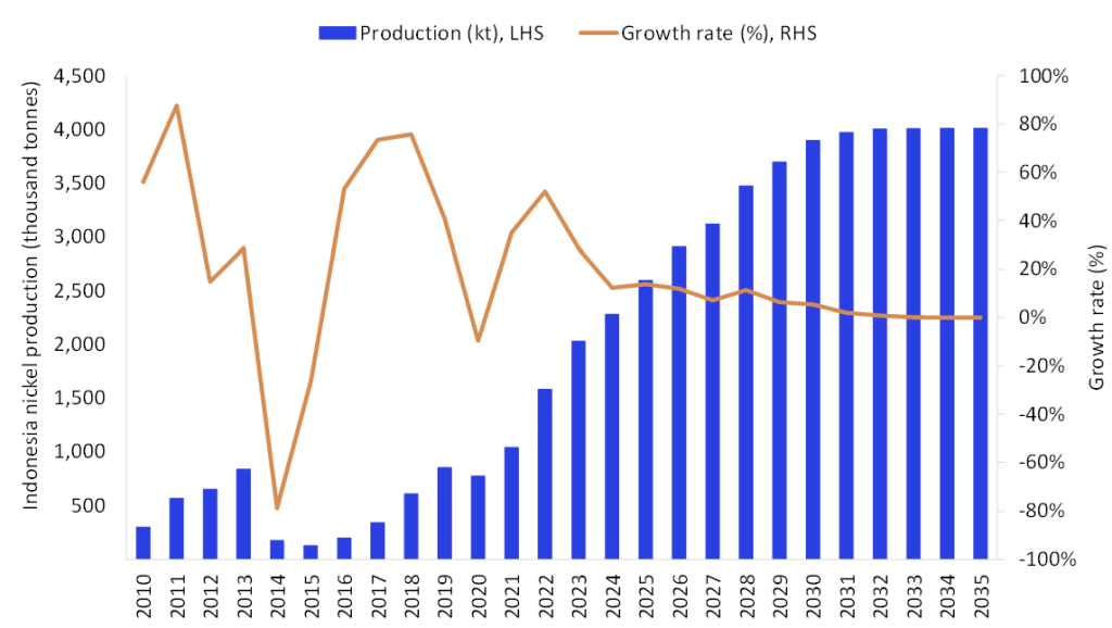 Indonesia is the world’s largest nickel producer, accounting for around 65% of global output. In 2025, production is estimated to have increased by 13.9% to 2.6 million tonnes (mt), driven by higher mine output from the Weda Bay, Gag Island, Huafei, Pakal Island, Pomalaa, PT Halmahera Persada Lygend, and Tapunopaka mines. Collectively, these operations reinforce Indonesia’s role as the primary source of incremental global nickel supply.