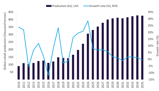 Over the forecast period, global cobalt production is expected to grow at a CAGR of 2.6% to reach 425.2 kilotonnes in 2035.