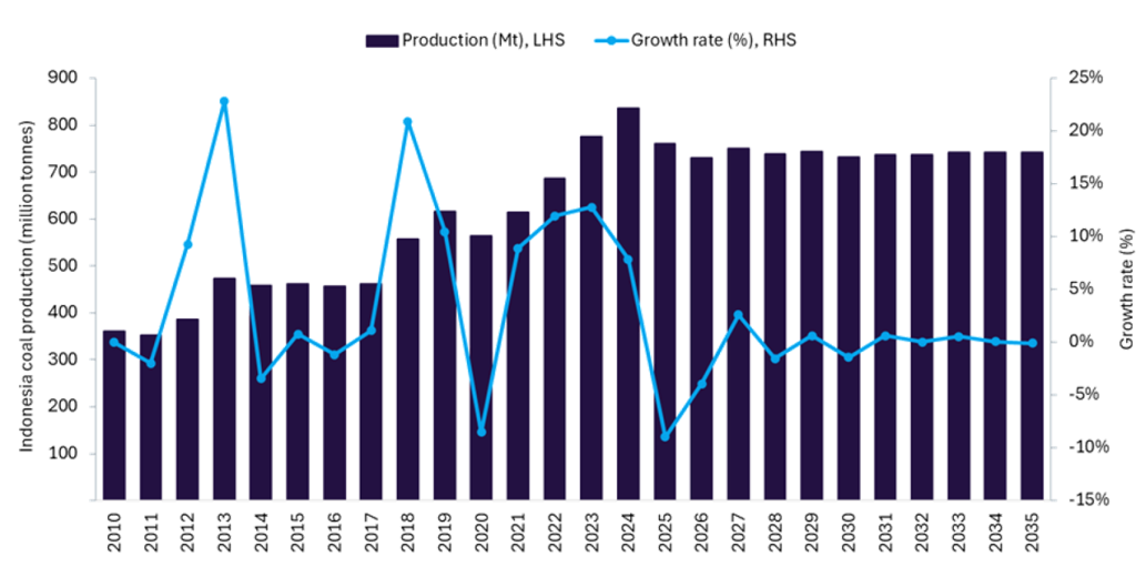 Looking ahead, Indonesia’s coal production is forecast to continue its gradual downward trend through 2035, driven by ongoing mine depletion, tightening environmental regulations and structural shift towards renewable energy domestically and across key export markets. While selective projects such as Bunyu (2025), PT Samantaka Batubara and PT Karya Usaha Pertiwi (2026) and the Indominco-Mandiri mine (2029) will provide localised support, these additions are unlikely to fully offset broader declines, anchoring Indonesia’s coal output on a structurally lower trajectory over the forecast period.