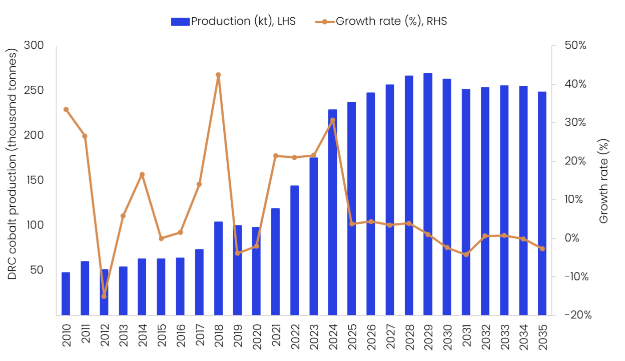 Beyond the US, the DRC is actively engaging with investors from Saudi Arabia, the European Union, and India as part of a broader strategy to diversify funding sources, reduce reliance on China, and strengthen the resilience of its mining sector over the long term. Over the forecast period (2026-35), DRC’s cobalt production is anticipated to grow with a compound annual growth rate (CAGR) of 0.03%, to 248,300t by 2035, based on known projects. This slow growth is attributable to the planned closure of three mines such as the Kalongwe Project (2029), Deziwa Project (2030) and Etoile Mine (2032), which collectively produced 20,430t in 2025.