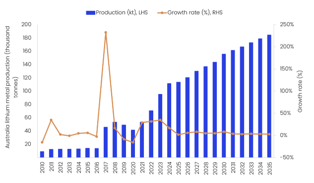Over the forecast period, Australia’s lithium mine production is forecast to grow at a compound annual growth rate (CAGR) of 4.9% between 2026 and 2035, reaching 184,500t by 2035. Key projects scheduled to commence operations during the forecast period include the Mount Finniss Restart Project (2028), Pilgangoora Expansion (P2000), Tabba Tabba, Lithium and Manna lithium projects in 2030, which are expected to underpin sustained production growth beyond the current market downturn.