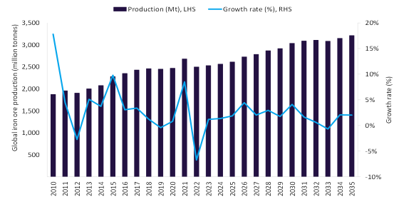 Global iron ore production is expected to grow steadily at a compound annual growth rate (CAGR) of 2.1% over the forecast period (2025-2035) to reach 3,213.2mt in 2035, as these new projects reach full production capacity.