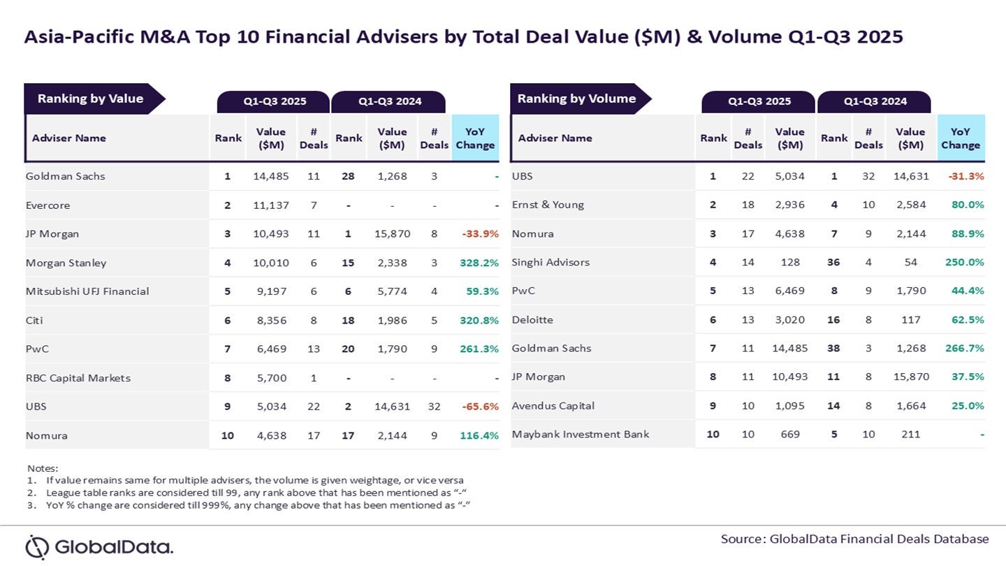 Goldman Sachs and UBS have secured their positions as the leading mergers and acquisitions (M&A) financial advisers in the Asia-Pacific…