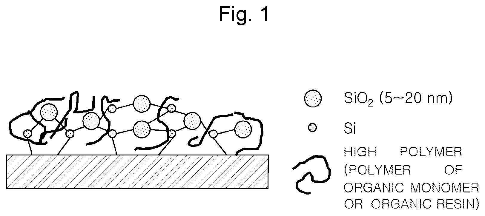 Furthermore, the composition specifies the percentage range of each component, such as 30 to 50 wt % of colloidal silica, 40 to 60 wt % of silane, 5 to 15 wt % of the organic monomer, 0.01 to 1 wt % of acid, 0.1 to 5.0 wt % of the organic resin, and 1 to 15 wt % of the solvent. The colloidal silica is required to have a silica content of 10 to 45 wt %. The silane component includes various options like vinyl trimethoxy silane, 3-methacryloxypropyl silane, and tetraethoxysilane. The organic monomer can be acrylic acid glacial, methyl acrylate, or other specified options. The acid component can be acetic acid, sulfuric acid, or other acids listed. The solvent component includes options like methanol, ethanol, and 2-propanol, among others.