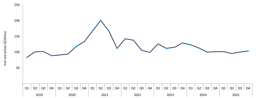 Iron ore prices fluctuated through 2025, averaging $100.2 per dry metric tonne unit (dmtu), down 8.4% YoY, as global steel production moderated and supply increased.