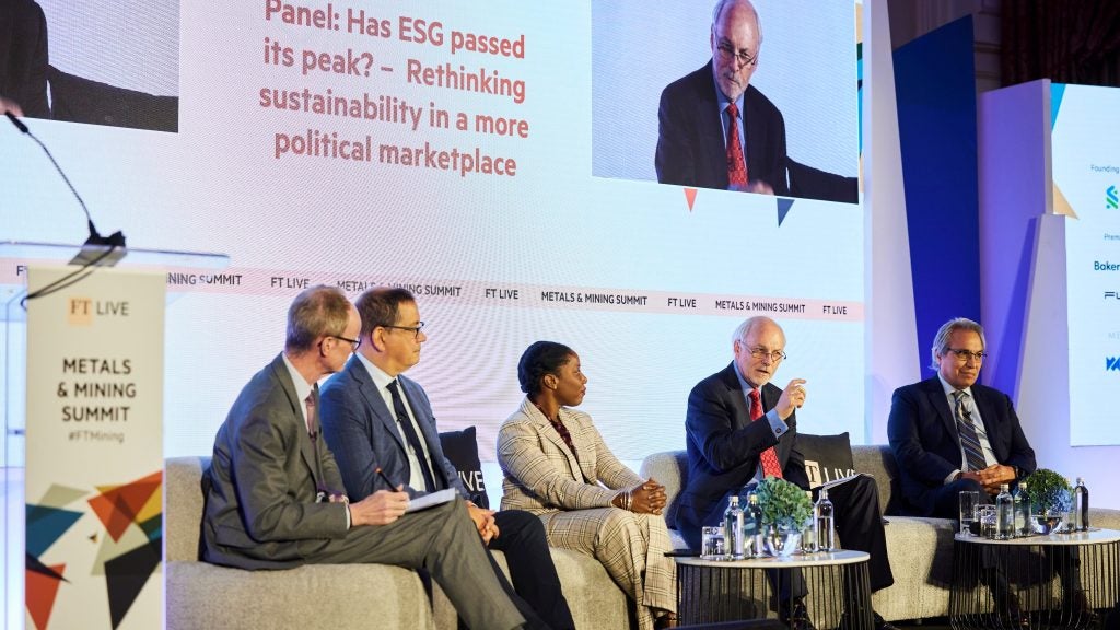 The ESG panel at the FT Live Metals and Mining Summit. (From left to right): Andrew Hill, Mark Podlasly, Stacy Hope, Bill Cobb and S. James Anaya. Credit: FT Live.