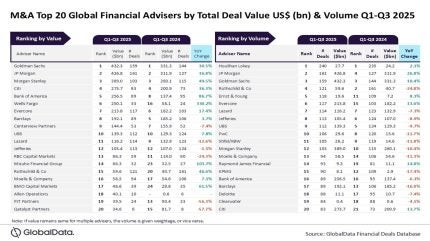 Goldman Sachs has secured the top spot as the leading financial adviser in mergers and acquisitions (M&A) based on deal value, while Houlihan Lokey has spearheaded the number of deals advised for the first three quarters of 2025, according to the latest Financial Advisers League Table by leading data and analytics company, GlobalData.