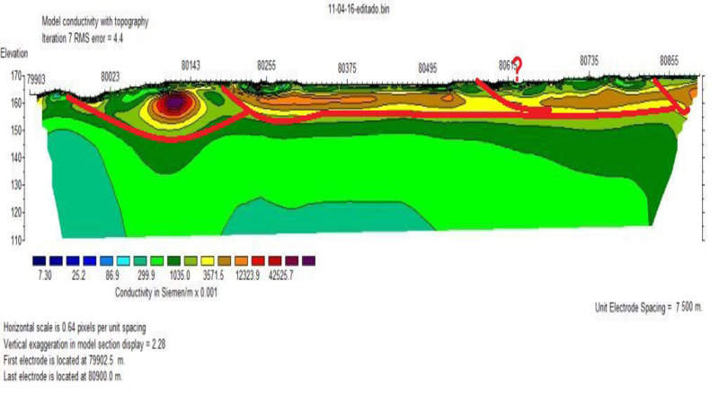 Image: Electrical tomography section showing interpreted paleo channels in red. Photo: courtesy of Blueskyuranium.com.