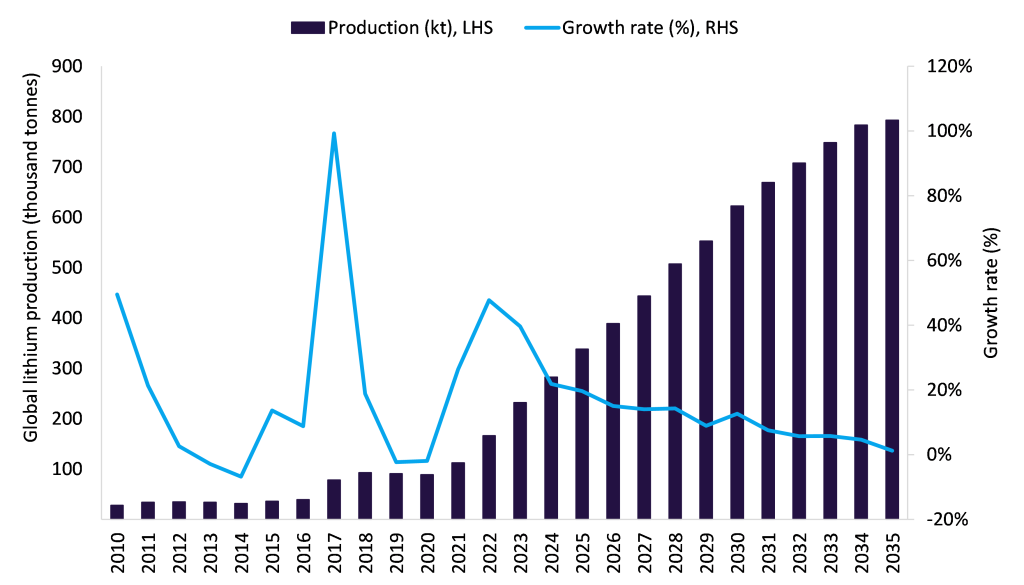 Global lithium production is expected to grow by a compound annual growth rate (CAGR) of 8.2% over the forecast period (2026-2035) to reach 792,800t by 2035.