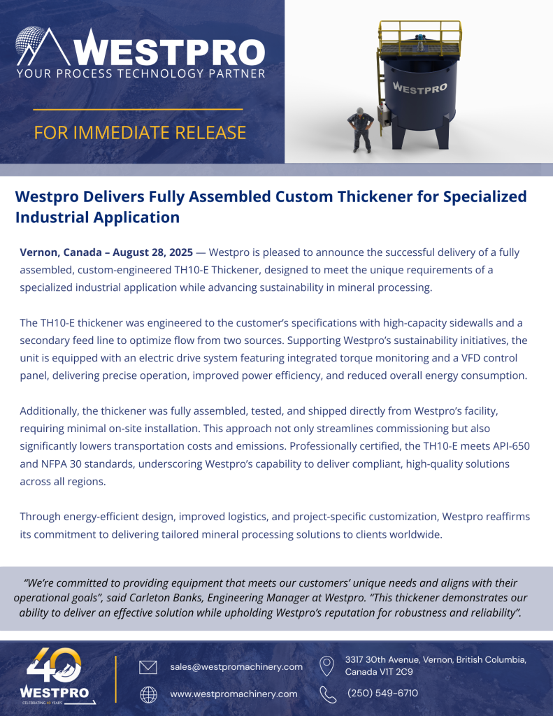Westpro is pleased to announce the successful delivery of a fully assembled, custom-engineered TH10-E Thickener, designed to meet the unique …