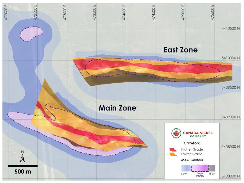 The Crawford project primarily consists of two zones - the main zone and the east zone. Credit: Canada Nickel Company Inc.