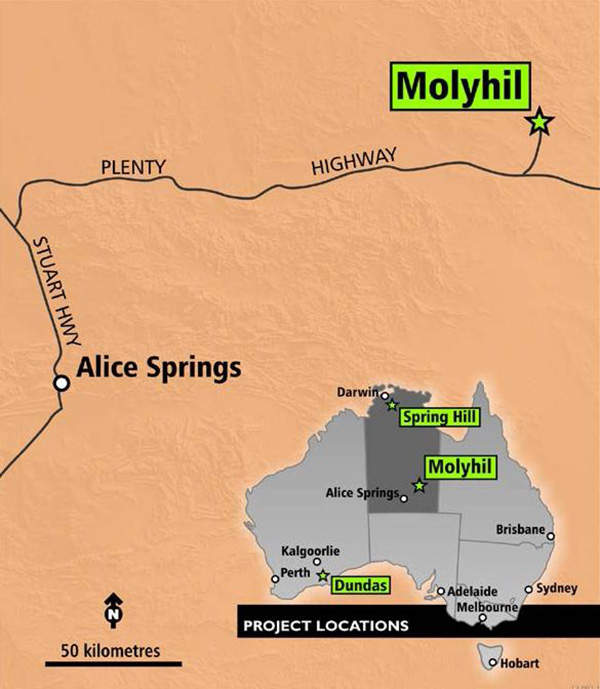 Molyhil tungsten and molybdenum mine is located 220km from Alice Springs in the Northern Territory of Australia. It is 100% owned and operated by Thor Mining.